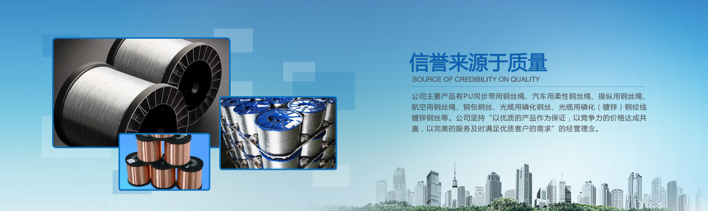 公司主要產品有PU同步帶用鋼絲繩、汽車用柔性鋼絲繩、操縱用鋼絲繩、航空用鋼絲繩、銅包鋼絲、光纜用磷化鋼絲、光纜用磷化(鍍鋅)鋼絞線、鍍鋅鋼絲等。經(jīng)過多年的研究、摸索、開發(fā),公司已形成了完整的技術、工藝軟件,產品實物質量均達到國際先進水平。